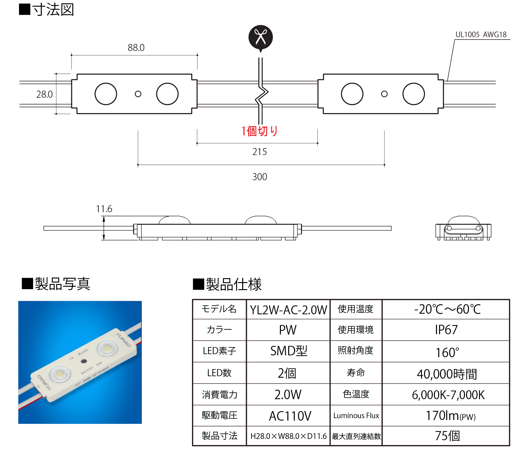 TOP 100V高品質LEDモジュール YL2W-AC-2.0+(PW) 定価: ¥22,550(税込) 価格: ¥15,500 (税込 ¥17,050) 販売期間: 数量: 50個 在庫 在庫あり 返品についての詳細はこちら